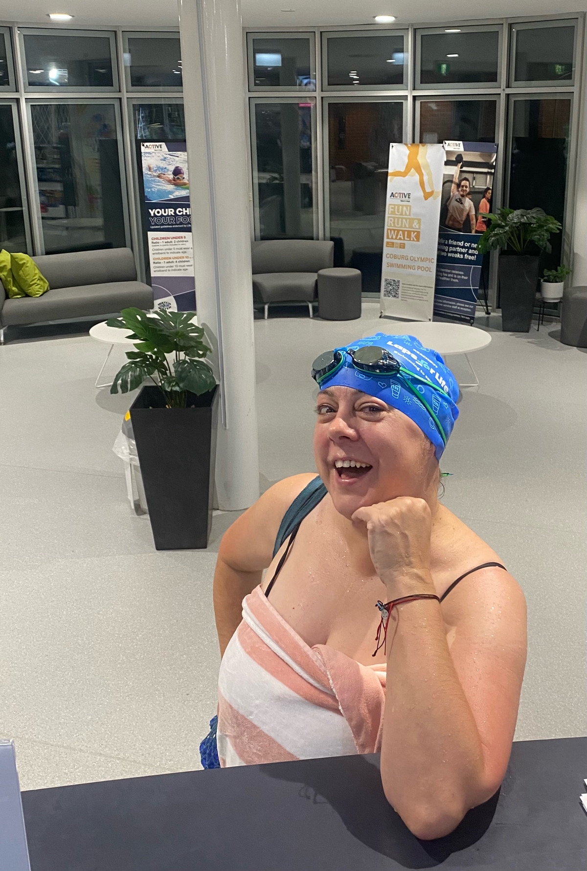 Love the swimming cap Great cause hope you feel good